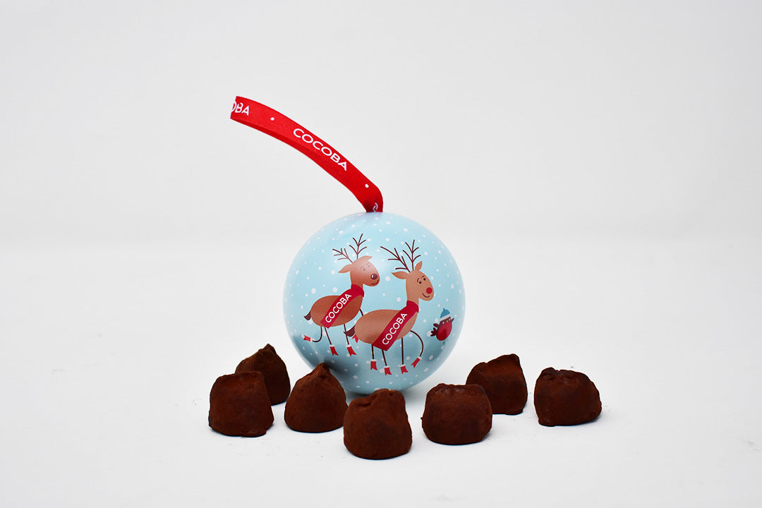 Bring sparkle to your Christmas tree with Cocoba’s Salted Toffee Truffles Christmas Bauble. Each festive bauble features a snowy Santa and Rudolph scene, making it a charming addition to any Christmas tree.